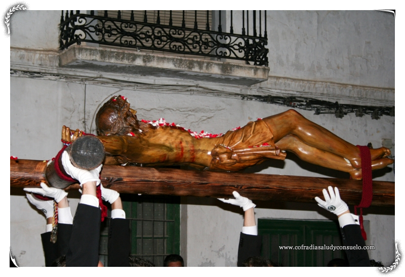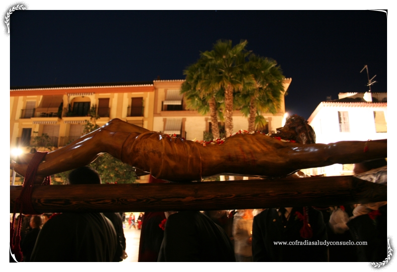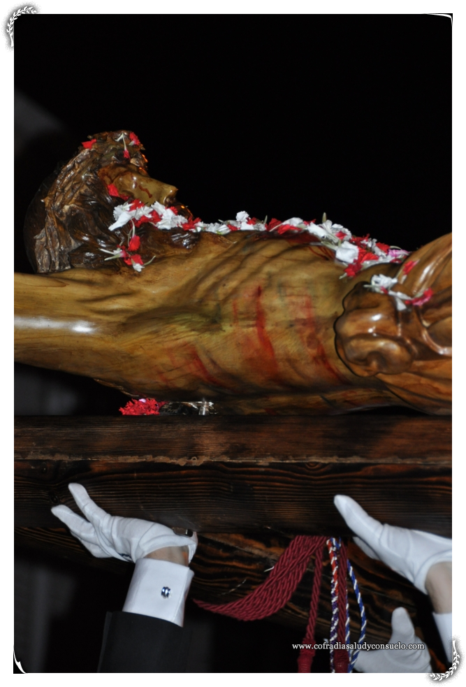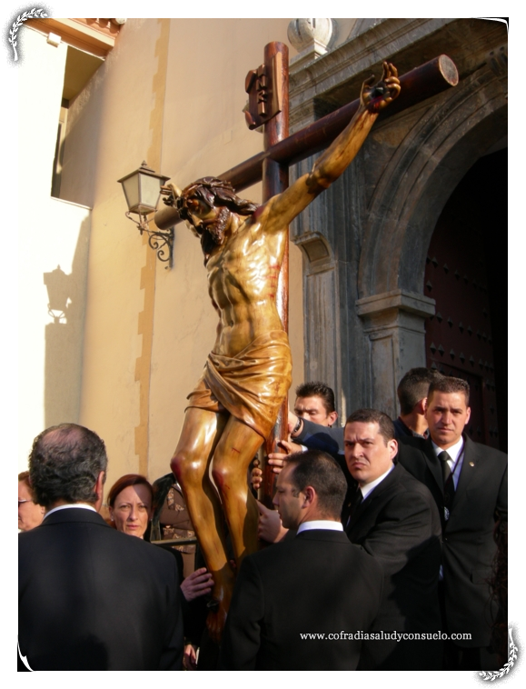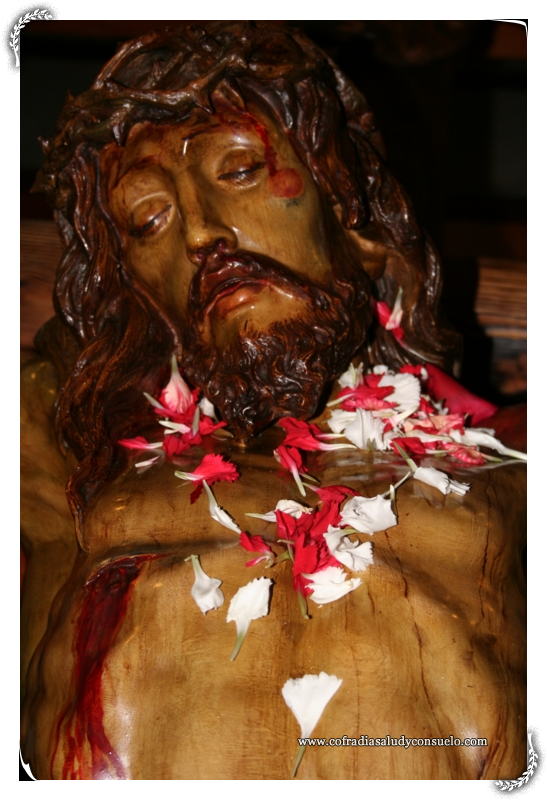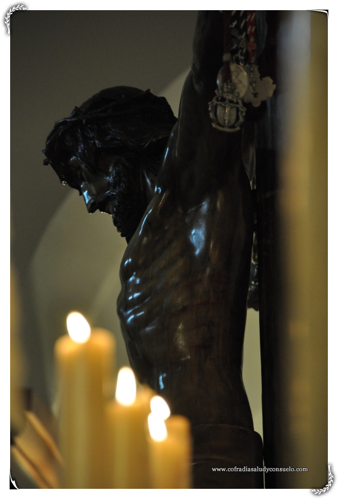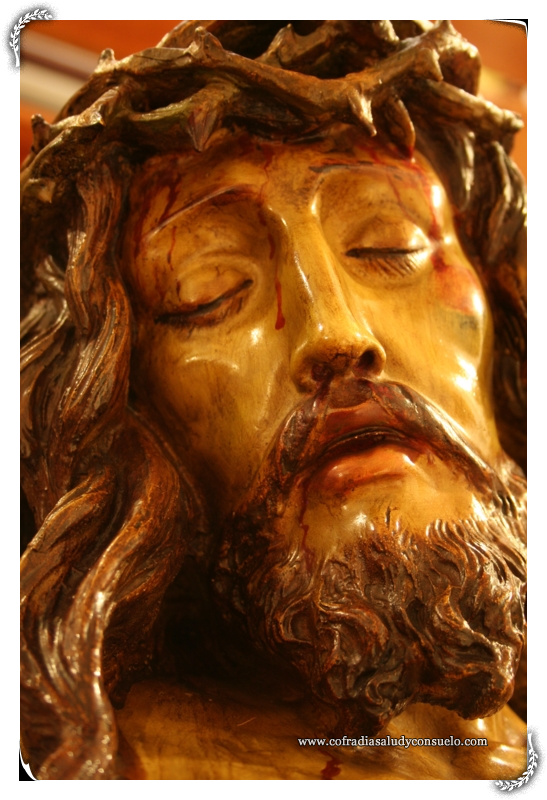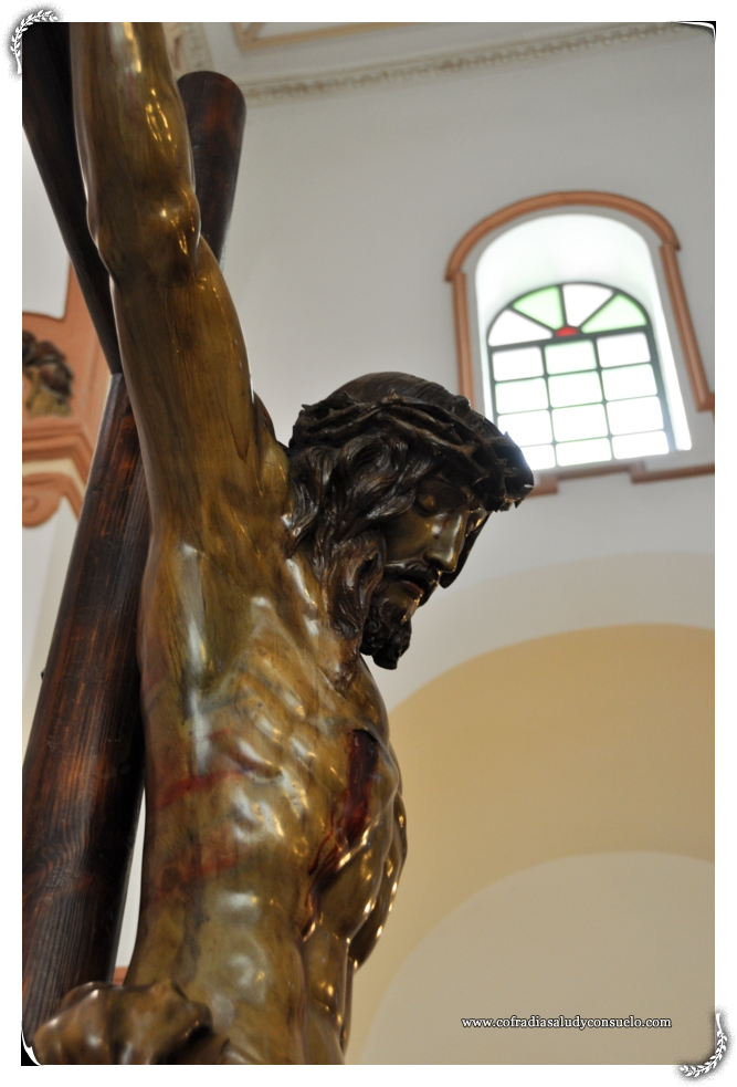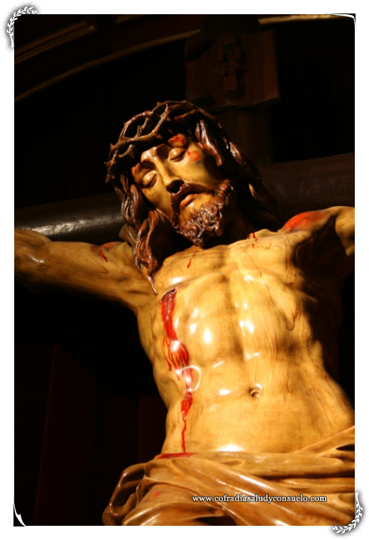 La efigie representa al Crucificado en el momento de su muerte. Jesús ya no es de este mundo pero, sin embargo, exhibe el semblante humano de quien va a reunirse en la casa del Padre. Es un rostro sereno, lleno de paz y ajeno, en su espíritu, al calvario a que ha estado sometido. Sus bellas y proporcionadas facciones idealizan al hombre que ha sido capaz de morir en la cruz para redimir a la humanidad. La inmediatez del último hálito de vida hace que la cabeza permanezca aun erguida, si bien con una leve inclinación. A su vez, un pequeño giro le permite quedar suavemente recostada y remarcar aún más la sensación de placidez. Por lo demás, el fino modelado consigue plasmar con exactitud la perfecta anatomía de la figura. Su examen se hace particularmente evidente en el torso y abdomen, captados ambos con la tensión muscular de un cuerpo vencido por su propio peso. Un ampuloso y agitado paño de pureza anudado a su lado derecho remarca la traza neobarroca que destila la obra. El ser humano en su tránsito a la divinidad, ese es el mensaje que ha pretendido trasmitir el artista en su obra. Y lo ha logrado conjugando la propia dualidad que converge en el Hijo de Dios. Como hombre ha sido azotado, escarnecido y maltratado hasta la extenuación. Las huellas del martirio se dejan ver en las heridas que recorren todo su cuerpo, aunque se muestran especialmente cruentas en la disposición de la corona de espinas. El atributo ha sido materialmente clavado a la cabeza permitiendo que finos regueros de sangre resbalen por su piel. Como Hijo de Dios ha asumido su destino, morir en la cruz, y lo hace con el perdón en los labios, de ahí la sensación de paz y quietud en su semblante.