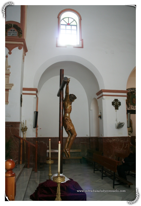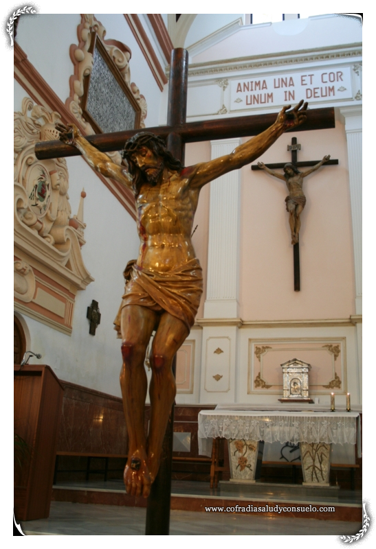 Fue allá por el año 1964 cuando el Padre Eugenio recibía la visita de un matrimonio que pasaba sus vacaciones en el vecino anejo de Torrenueva. Son fervientes devotos del Santísimo Cristo de la Salud de la ciudad de Santafé, al que se han encomendado ante una difícil situación familiar. La gracia le ha sido finalmente concedida y en cumplimiento de su promesa han decidido donar un crucificado bajo esta concreta advocación. El religioso se presta a acogerle y les invita a examinar el lugar donde se erigirá su capilla. Por orden expresa de los donantes todos los gastos corren a su cargo y la única condición que imponen es que su nombre permanezca siempre en el anonimato. Transcurridos unos días el superior agustino marcha de vacaciones a Bilbao. A su paso por Madrid se le ofrece un crucificado propiedad de la Orden Agustiniana, pero personalmente insiste en adquirir una imagen nueva. Y así es como acude a los Talleres Caderot, reputada casa especializada en imaginería religiosa que es donde se concreta el encargo del que hoy es nuestro sagrado titular.